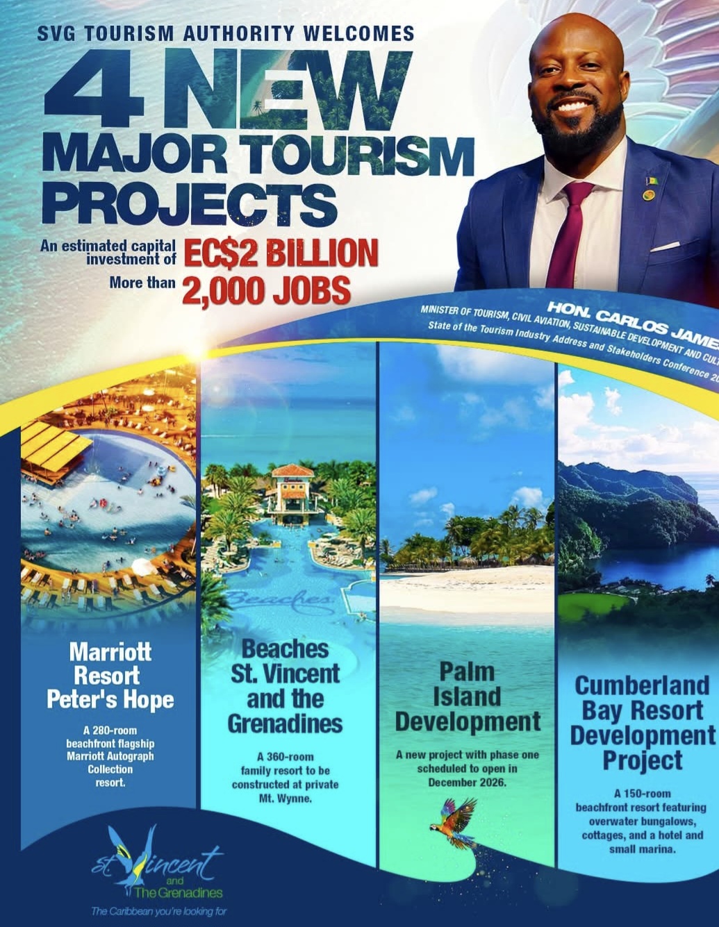 Having more than 100,000 overnight visitors for the first time in its history, SVG now has to ramp up the number of rooms available for tourists. This has certainly been high on the government agenda and, “hot of the press”, it has been announced that a new Marriot Hotel is coming, as well as a half a billion dollar “Beaches” resort (the same company as Sandal’s). There will also be a resort development on beautiful Cumberland Bay. All these properties will be on the mainland of St. Vincent. Finally, Palm Island resort has been re-built following destruction in Hurricane Beryl, so this will re-launch on the tiny Grenadine island in the far south of the country.